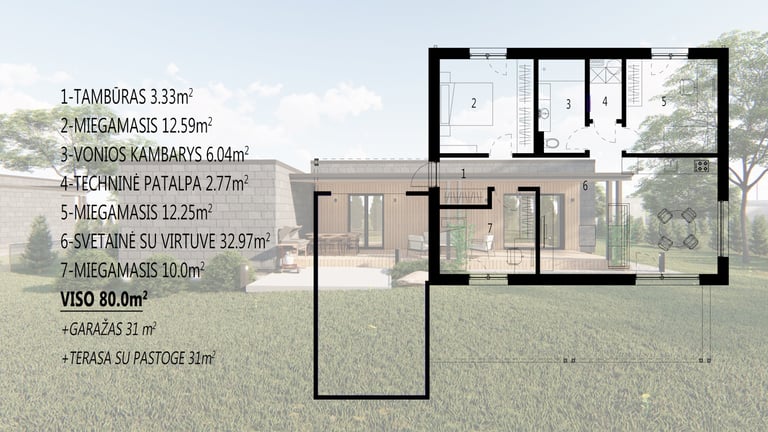 Papildomai numatyta pastogė prie durų ir terasa su stogine prie svetainės.